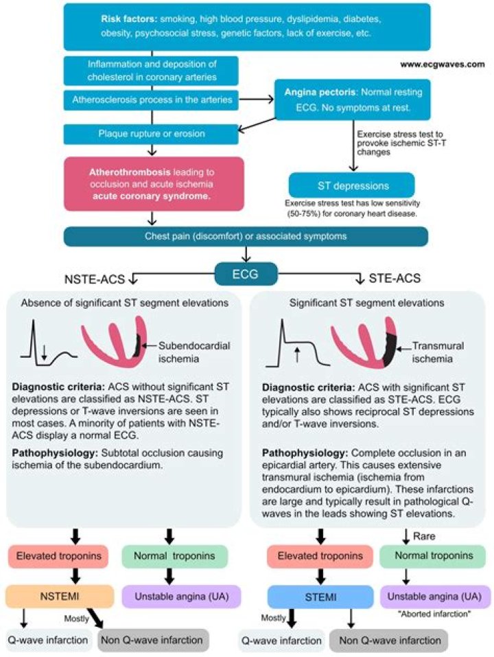 Acute coronary syndromes result from a sudden blockage in a coronary artery. This blockage causes unstable angina or heart attack (myocardial infarction), depending on the location and amount of blockage. A heart attack is death of heart tissue due to lack of blood supply.