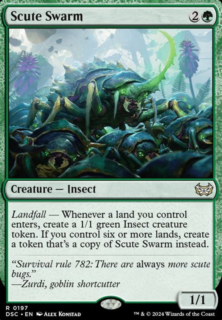 Scute Swarm (Zendikar Rising) - Gatherer - Magic: The Gathering. Card Text: Landfall — Whenever a land enters the battlefield under your control, create a 1/1 green Insect creature token. If you control six or more lands, create a token that's a copy of Scute Swarm instead.