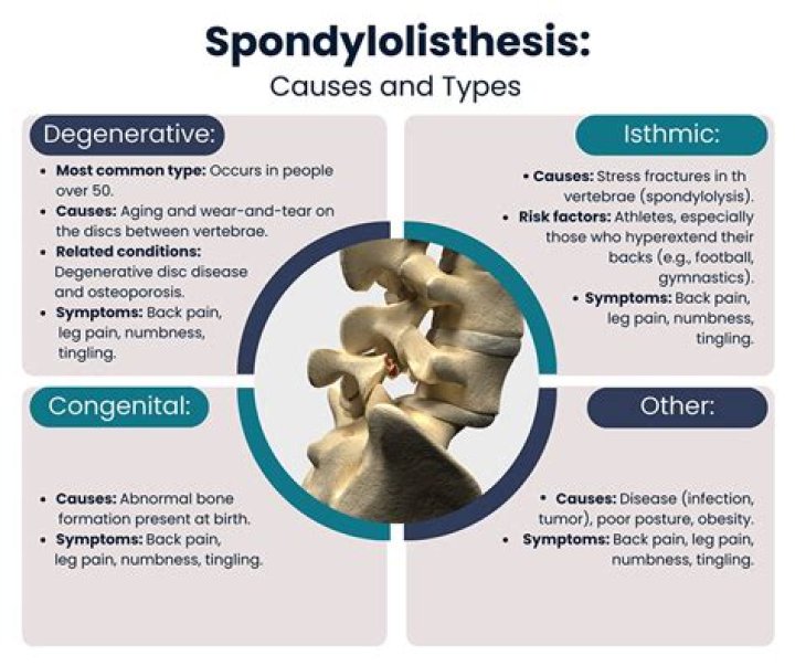 Spondylolisthesis is a condition involving spine instability, which means the vertebrae move more than they should. A vertebra slips out of place onto the vertebra below. It may put pressure on a nerve, which could cause lower back pain or leg pain.